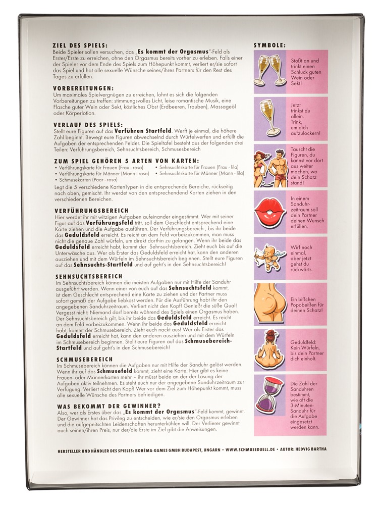 Ein steigendes sexuelles Verlangen ist garantiert – aber Vorsicht: Der Orgasmus darf bis zum Spielende von keinem der Spieler erreicht werden! Kommt einer zu früh, muss dieser alle sexuellen Wünsche des Partners erfüllen.