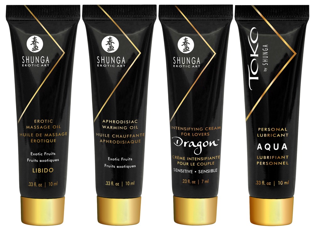 Ideal für Ihre amourösen Eskapaden. Inhalt: Erotisches Massageöl (10ml), Wärmendes Körperöl (10ml), Massagekerze (30ml), Gleitmittel TOKO AQUA (10ml), DRAGON Intensivierende Creme für Liebende (7ml).