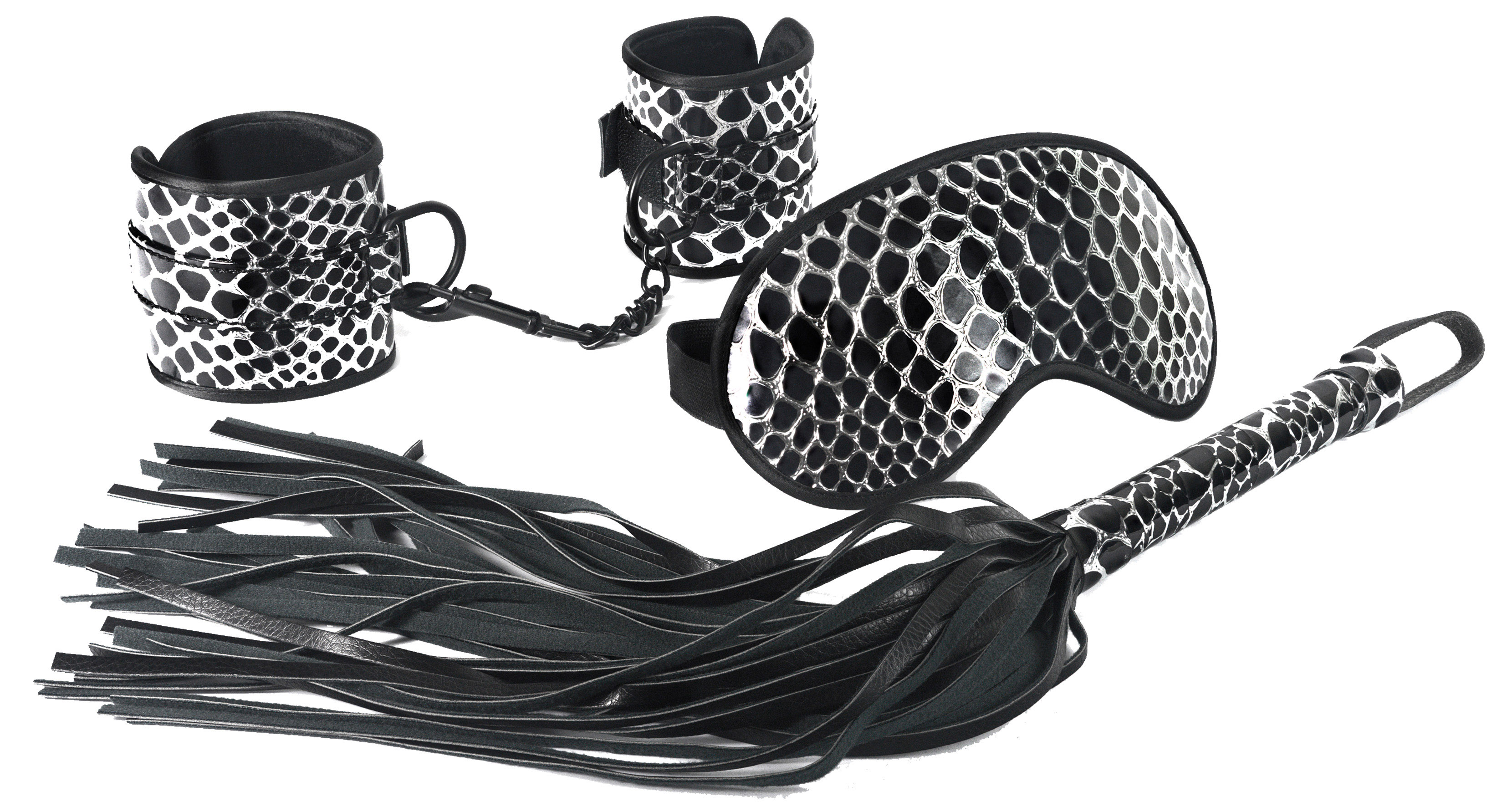 Elegantes Bondage Kit aus Kunstleder, bestehend aus Maske, Handschellen und Peitsche.