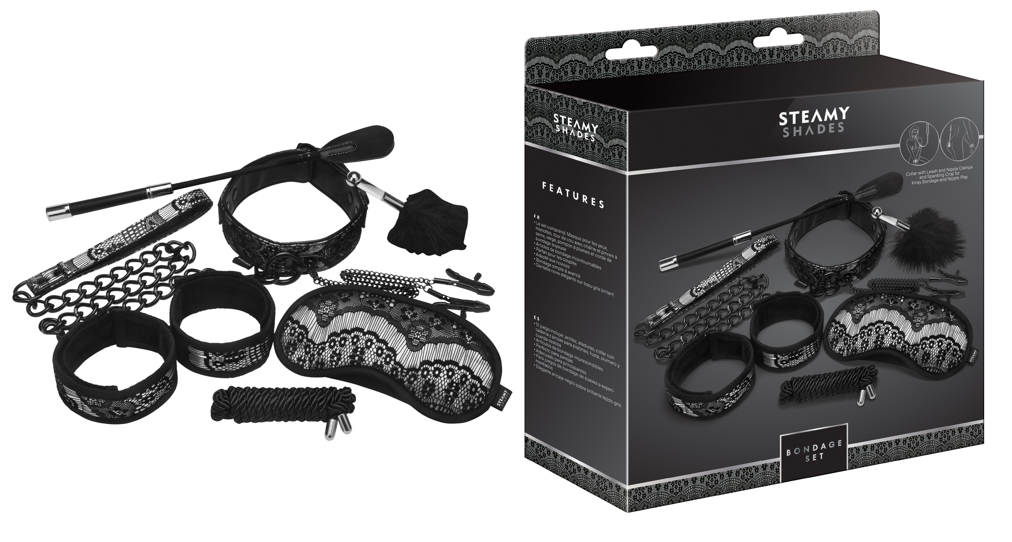 Set beinhaltet: Augenmaske, Manschetten, Halsband mit Kette und Brustwarzenklemmen, Gerte, Federpuschel und seidiges Fesselseil, unverzichtbare Fesselprodukte, perfekt für Paare, anfängerfreundlich, leichte bis fortgeschrittene Fesselung, elegante schwarze Spitze auf glänzendem grauem Stoff.