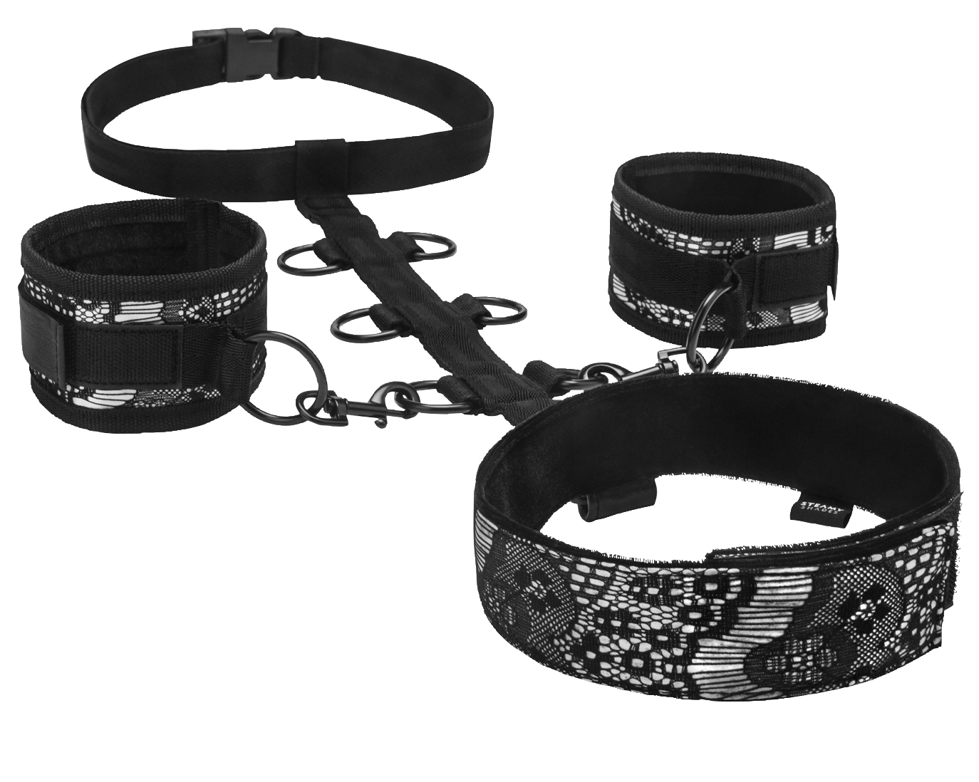 Halsband mit Manschetten und Hüftgurt, perfekt für fortgeschrittene Fesselspielchen, Klettverschlüsse für sichere Fesselung und einfache Entfernung, 6 D-Ringe für die perfekte Positionierung, Hüftgurt verhindert ein Verrutschen, kann auf Brust oder auf dem Rücken des Körpers getragen werden. Halsband & Manschetten (100% Polyester); Riemen & Hüftgurt (100% Polypropylen); Niete, Ringe, D-Ringe & Karabiner (100% nickelfreies Eisen); Verbindungsstück am Halsband (100% Polyurethan); Verschluss (100% ABS-Kunststoff)