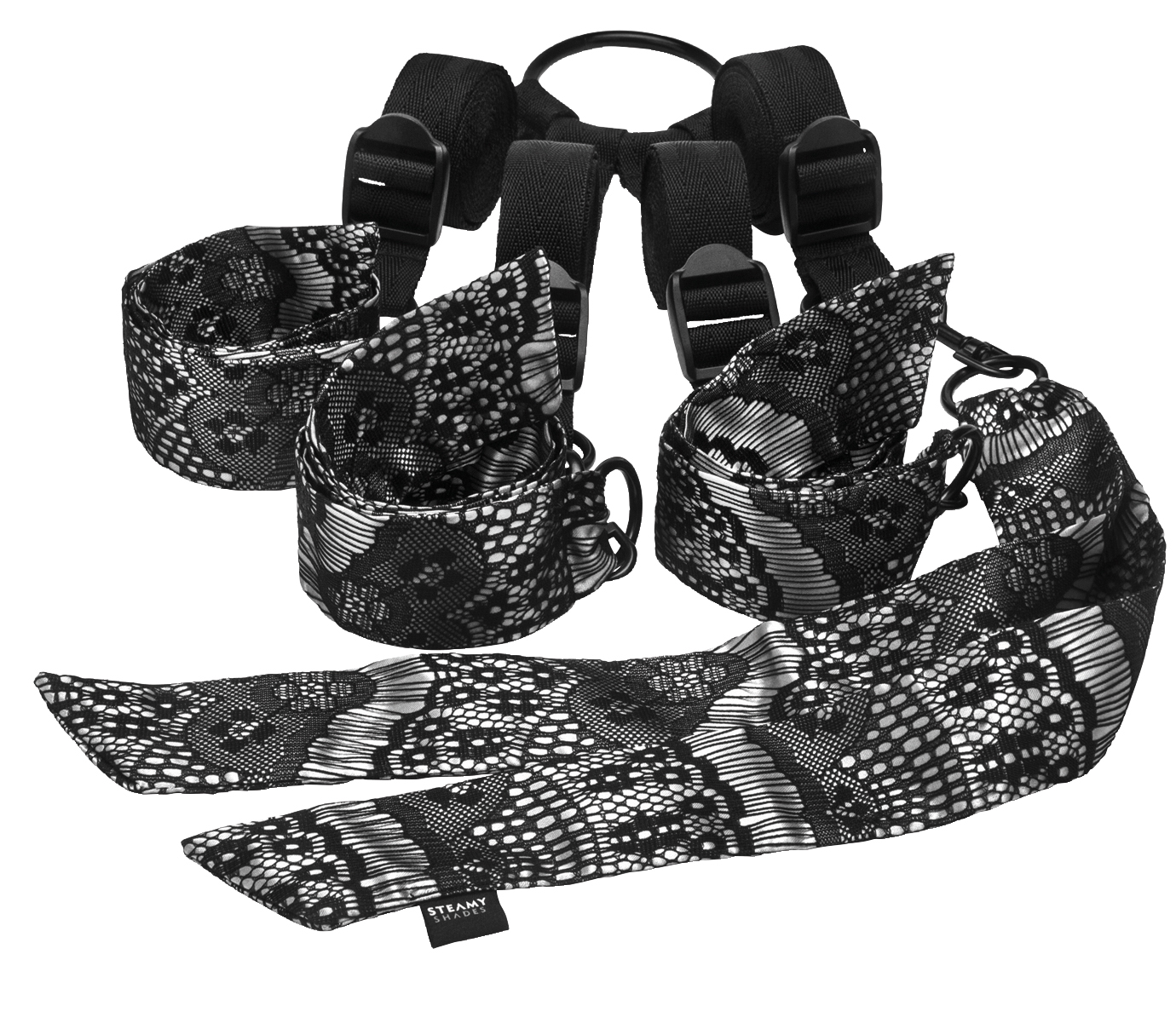System für Ganzkörperfesselung, Mittelband um das Fesselsystem zu verbinden, verstellbar und passend für jede Bettgröße, D-Ring Anschlüsse ermöglichen eine einfache Handhabung, einfach unter eine Matratze spannen, elegante schwarze Spitze auf glänzendem grauem Stoff, sinnliche weiche Satinbänder. Bänder (100% Polyester); Riemen (100% Polypropylen); Ringe & Karabiner (100% nickelfreies Eisen); Verstellschnallen (100% ABS-Kunststoff)