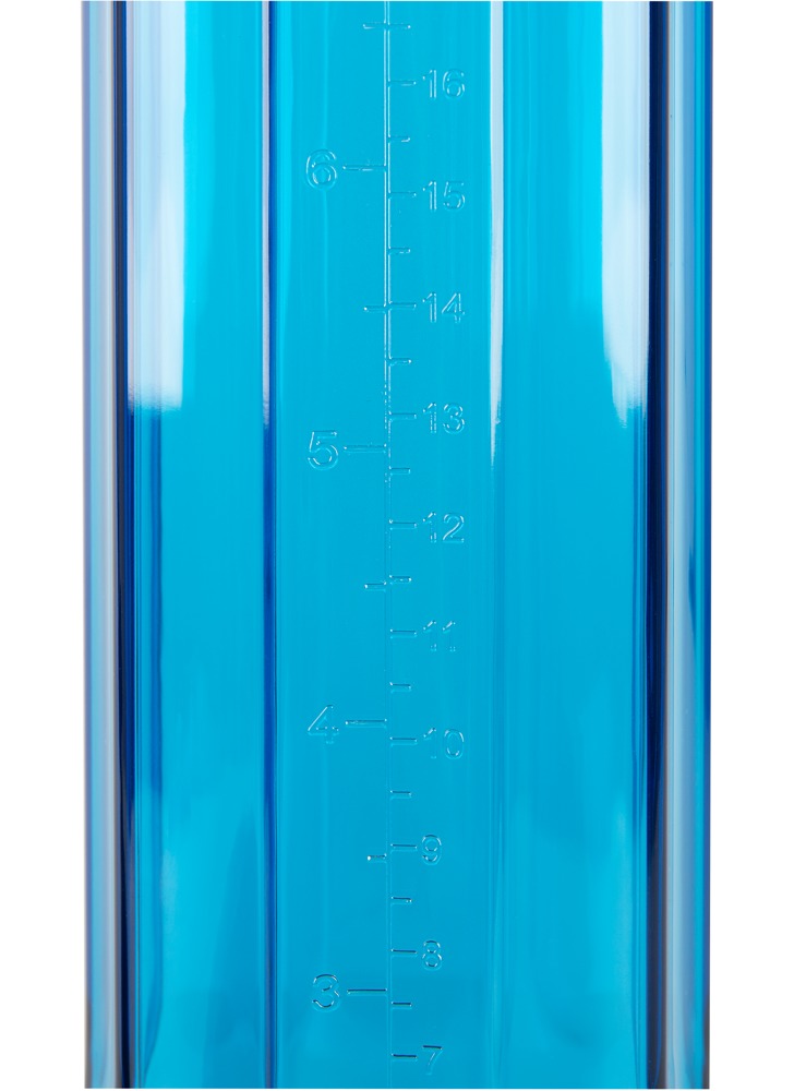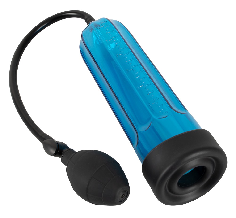 Penispumpe mit blau-transparentem Zylinder und Messskala, an der Sie die Erfolge des Pumpens mit der handlichen Ballpumpe ablesen können.