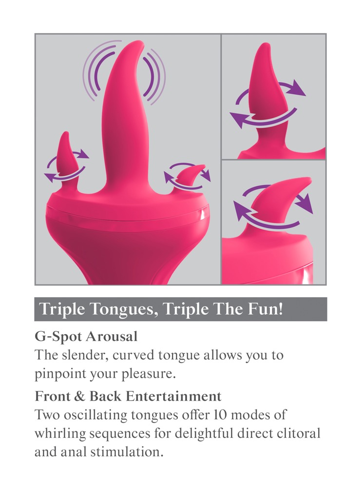 Dieser Vibrator stimuliert gleich dreifach mit seinen streichelzarten Zungen. Die große Zunge vibriert in 10 verschiedenen Modi, während die beiden kleinen Stimulatoren Klitoris und Anus mit rotierenden Bewegungen in 10 Modi verwöhnen. Rotation und Vibration kann separat gesteuert werden für maximalen und individuellen Spaß! Spritzwassergeschützt. Inklusive USB-Ladekabel.