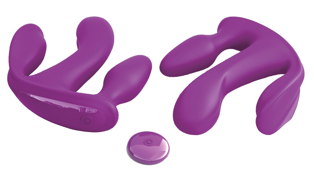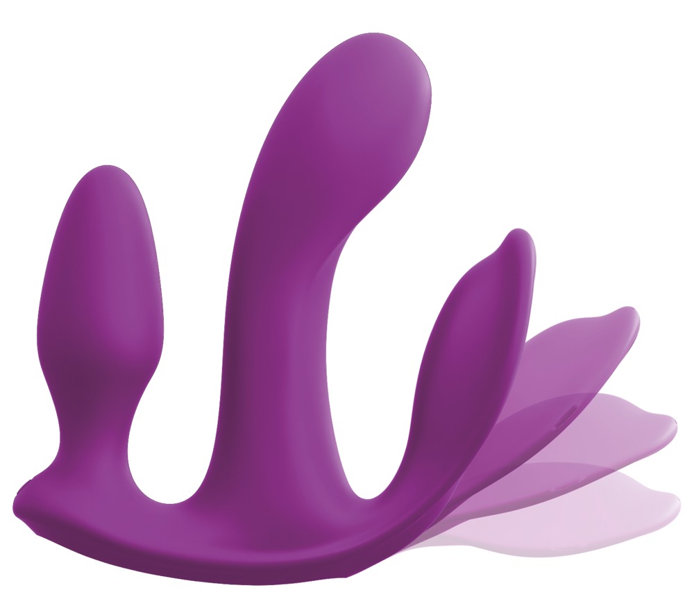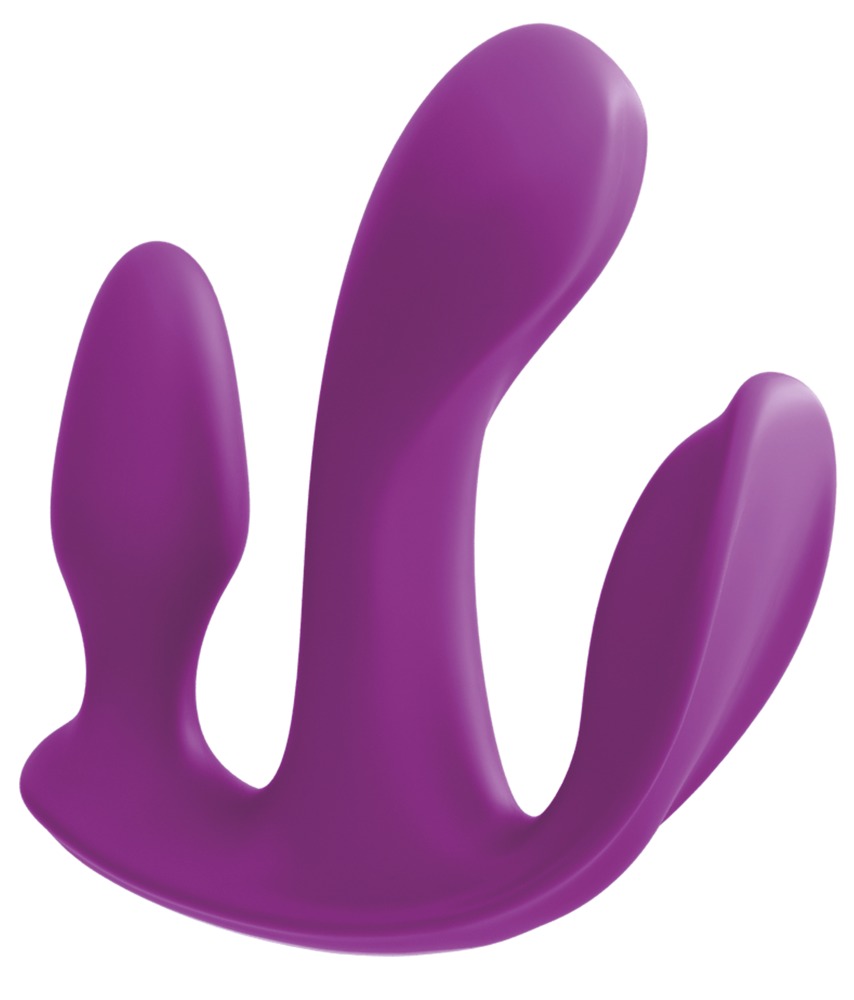 Dieser Vibrator ist zur dreifachen Stimulation ideal – das streichelzarte Silikon des Vibrators gleitet wie von selbst hinein, während der Flügel die Klitoris sanft bespielt und der Analplug den Anus zum Beben bringt. Drei Motoren stimulieren dabei in 10 aufregenden Vibrationsmodi. So kann dieser Super-Stimulator auch im Höschen getragen werden und einfach mit der beiliegenden Fernbedienung gesteuert werden. Spritzwassergeschützt. Inklusive USB-Ladekabel und Batterie für die Fernbedienung: 1 x CR1620.
