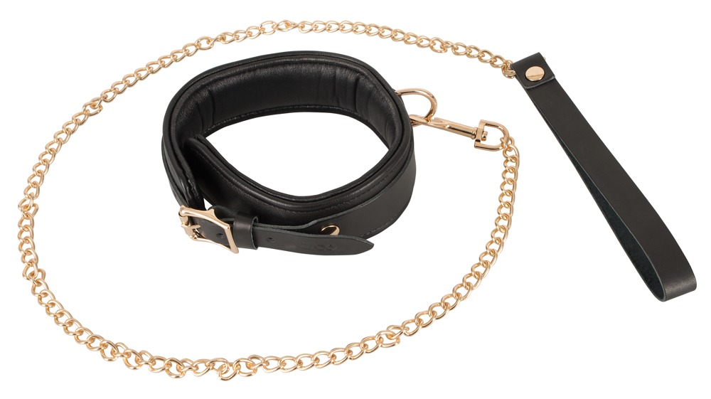 Diese Halsfessel ist aus besonders hochwertigem Leder, welches chromfrei gegerbt wurde. Die Innenseite ist gepolstert und schmiegt sich so perfekt an den Hals an. Der edle Look des Leders wird durch die goldenen Details an Schnalle und Kette der Leine verstärkt. Also perfekt für alle die, die es extravagant mögen.