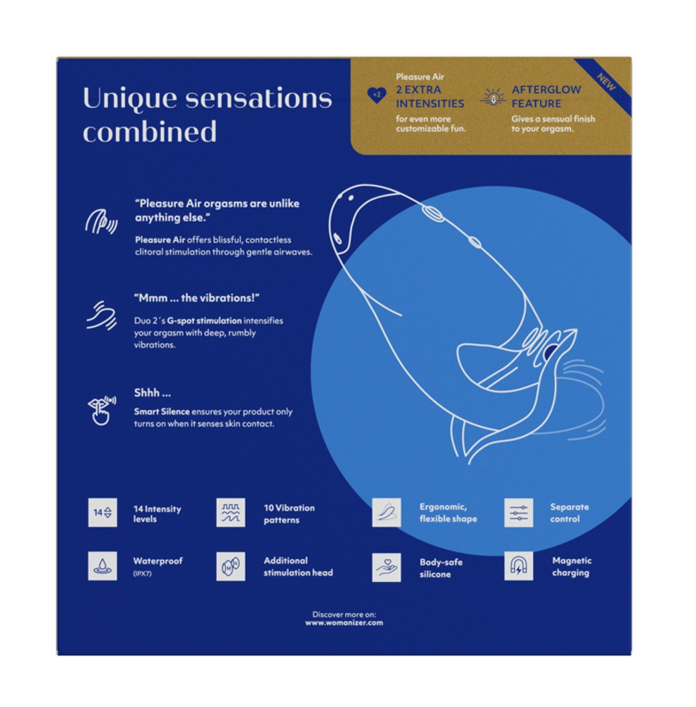 Der DUO bietet 12 Intensitätsstufen für die klitorale Stimulation. Für den G-Punkt stehen ebenfalls 14 Intensitätsstufen und zusätzlich 10 Vibrationsmodi zur Auswahl. Beide Funktionen, Vibrator und Pleasure Air™ Technologie, lassen sich unabhängig voneinander steuern. Hinzukommt die Afterglow Feature - d.h. mit einem einfachen Knopfdruck schaltet sich der Womanizer auf niedrigste Stufe zurück