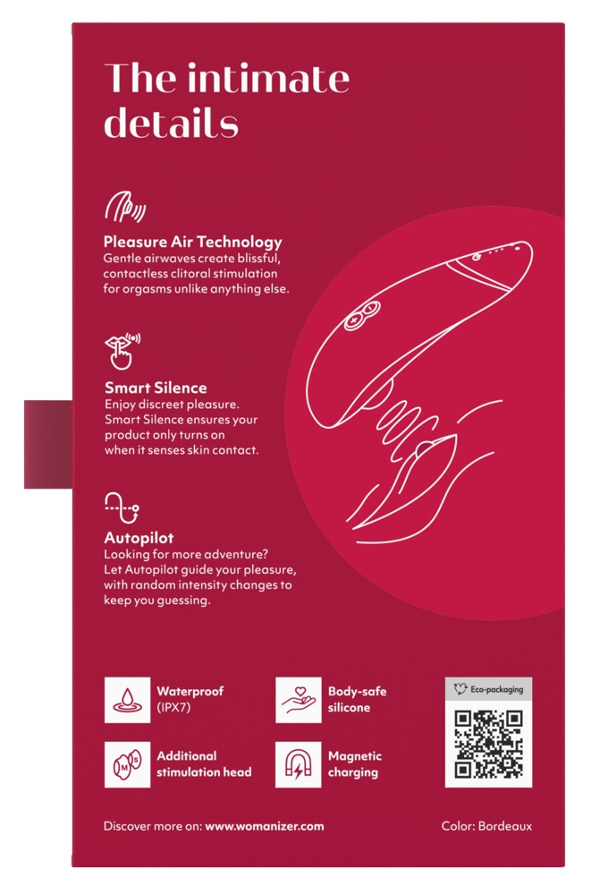 Der Womanizer Premium 2 ist ein starker, dennoch flüsterleiser Druckwellenstimulator und verwöhnt jetzt mit 14 (statt 12) verschiedenen Intensitäten, die bequem per Knopfdruck (+/-) rauf und runter steuerbar sind. Die patentierte Pleasure Air Technology stimuliert die Klitoris haargenau ohne Berührung - auch in Bad und Dusche, da wasserdicht. Die neue verbesserte Autopilot-Funktion wechselt die Intensitäten automatisch, um das Verwöhnen noch überraschender zu gestalten. Dank Smart Silence-Funktion wird der Womanizer Premium 2 nur dann aktiviert, wenn der Kontakt zur Haut gewährleistet ist. Bis dahin läuft der Premium 2 im nahezu geräuschlosen Standby-Modus. Nach 10 Minuten Inaktivität schaltet sich der Womanizer Premium 2 automatisch ab.