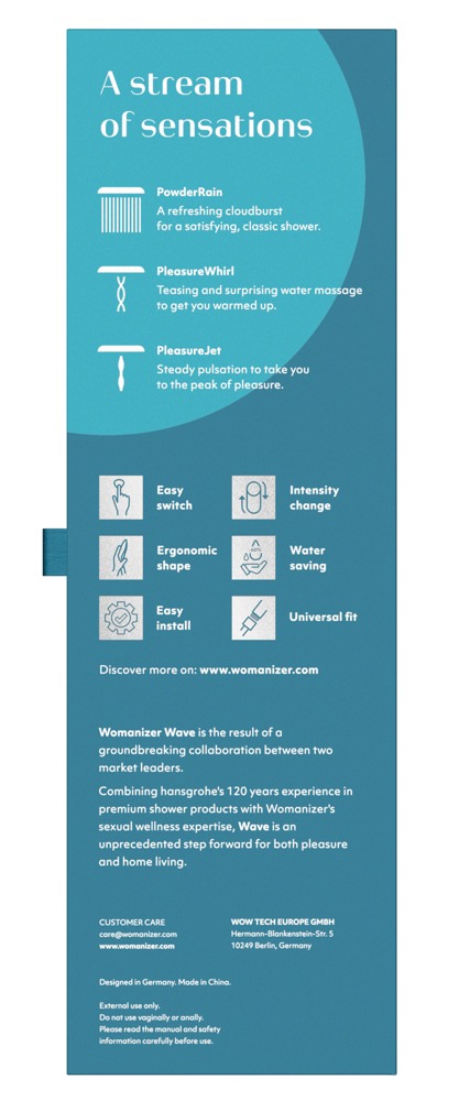 Tauche ein in neue sinnliche Duschabenteuer mit dem ergonomisch perfekt designten Multifunktions-Duschaufsatz Wave von Womanizer, der die patentierte PleasureJet-Technologie verwendet. Dieser einzigartige Duschkopf wurde in Zusammenarbeit mit hansgrohe entwickelt und bietet Premium-Qualität made in Germany. Hier steht nicht nur die Körperfpflege und -reinigung im Mittelpunkt, sondern auch sinnlich stimulierende Verwöhn-Momente in Dusche und Bad.