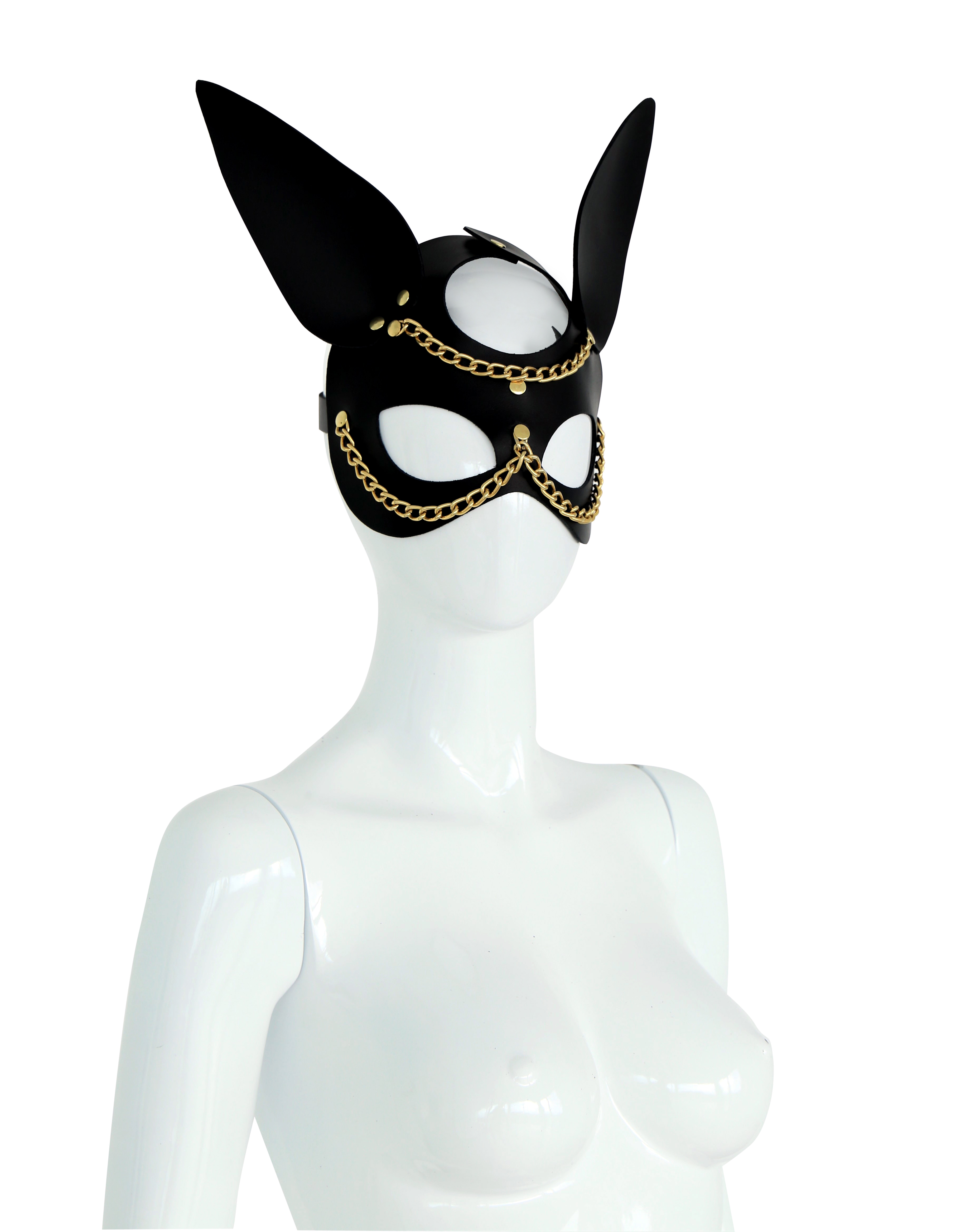 - edles Design: Die Maske präsentiert sich in einem edlen Design mit Hasenohren aus schwarzem Leder, goldenen Metallteilen und einer anmutigen goldfarbenen Kette.