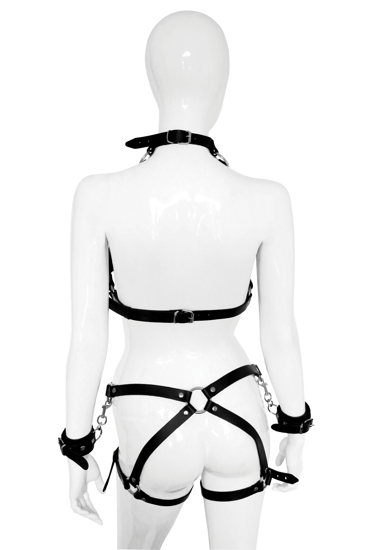 BH sowie Harness aus robusten Lederriemen mit integrierten (abnehmbaren) Handfesseln aus Leder.