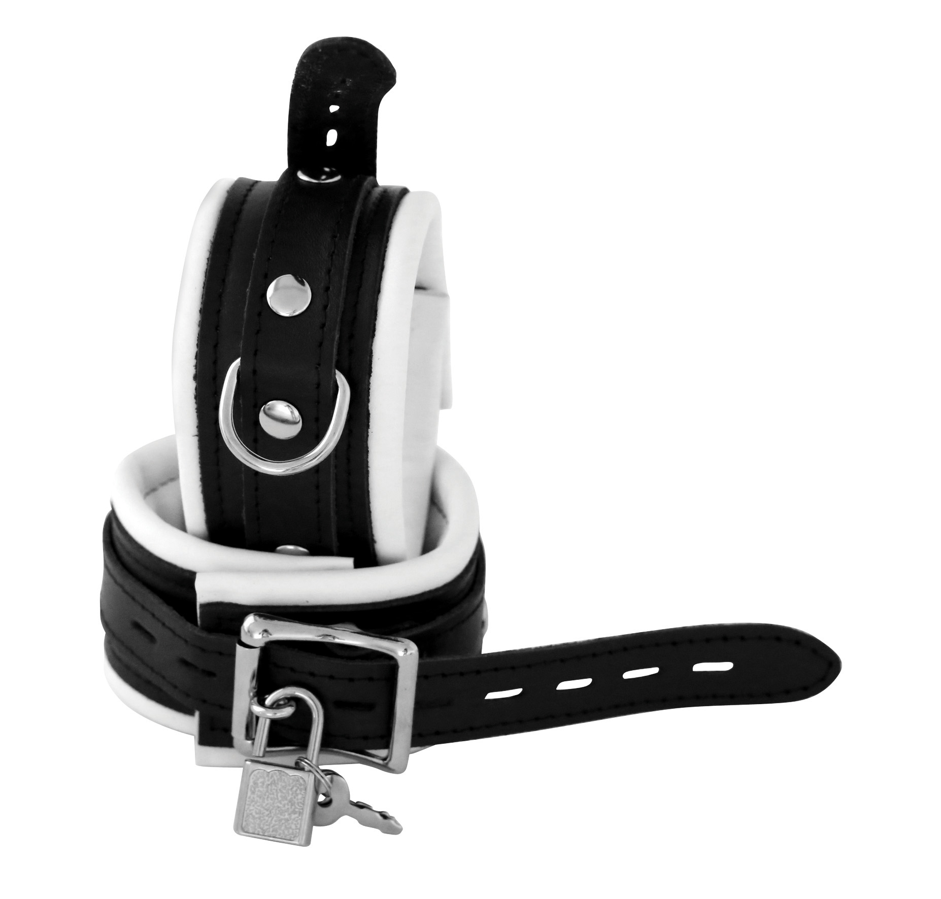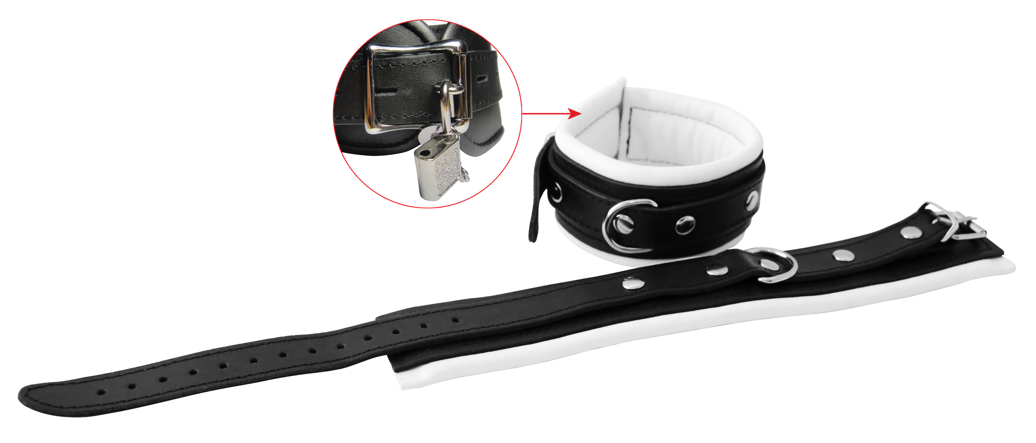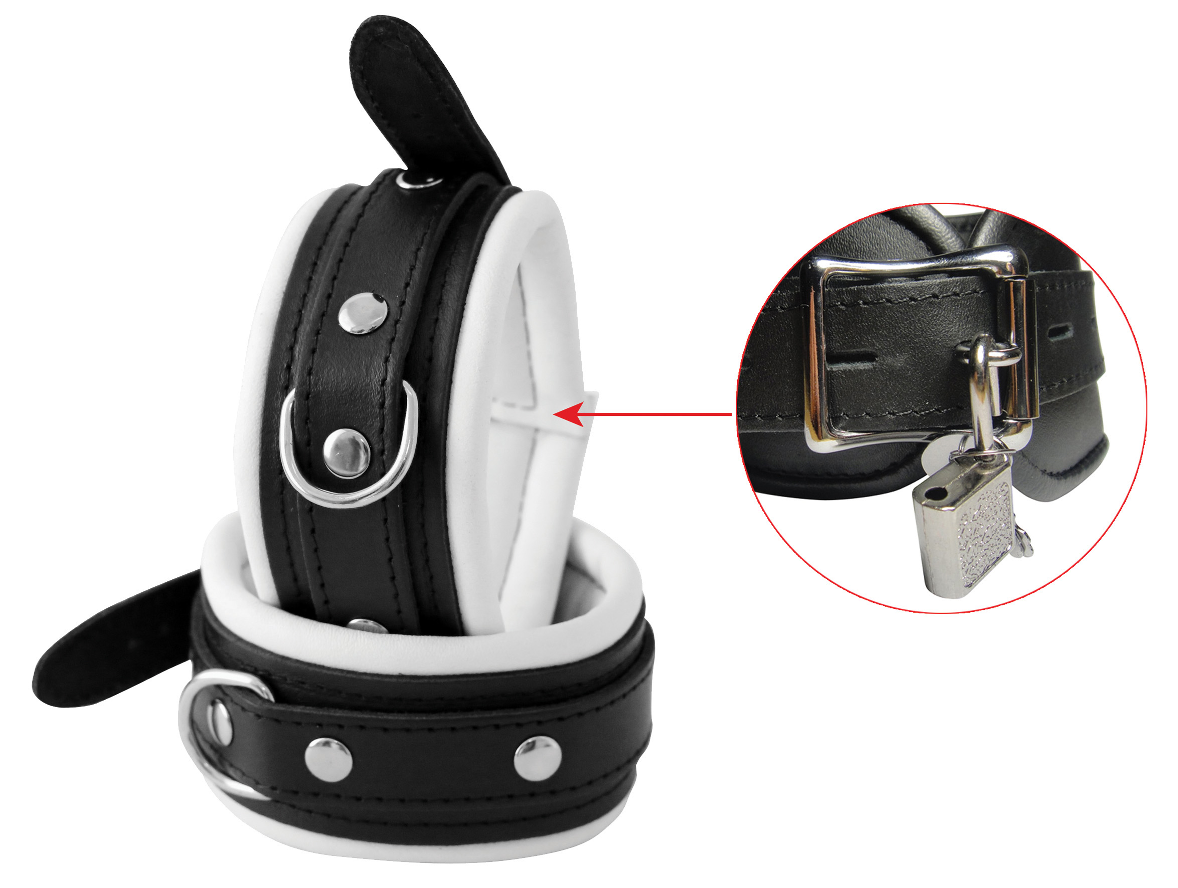 Farbe: weiss/schwarz. Innen mit weichem Leder gepolstert. D-Ring geschweißt (inkl. 2 Schlösser).