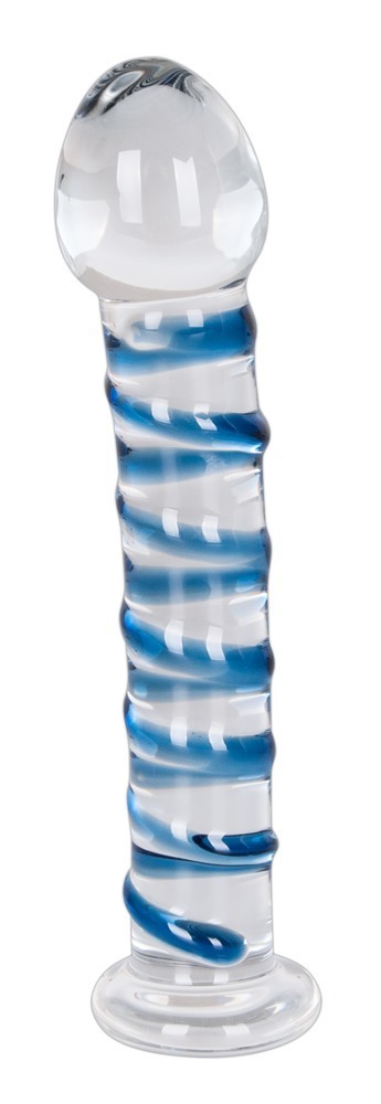 Leicht gebogener Dildo aus transparentem Qualitätsglas mit blauen, erhabenen Reizspirale am Schaft und Standfuß.