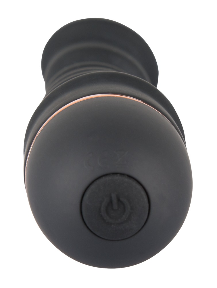 Schwarzer Vibrator mit angedeuteter Eichel und 5 stimulierenden Reizwellen am Schaft. Die sagenhaften 20 Vibrationsmodi sind per One-Button steuerbar.