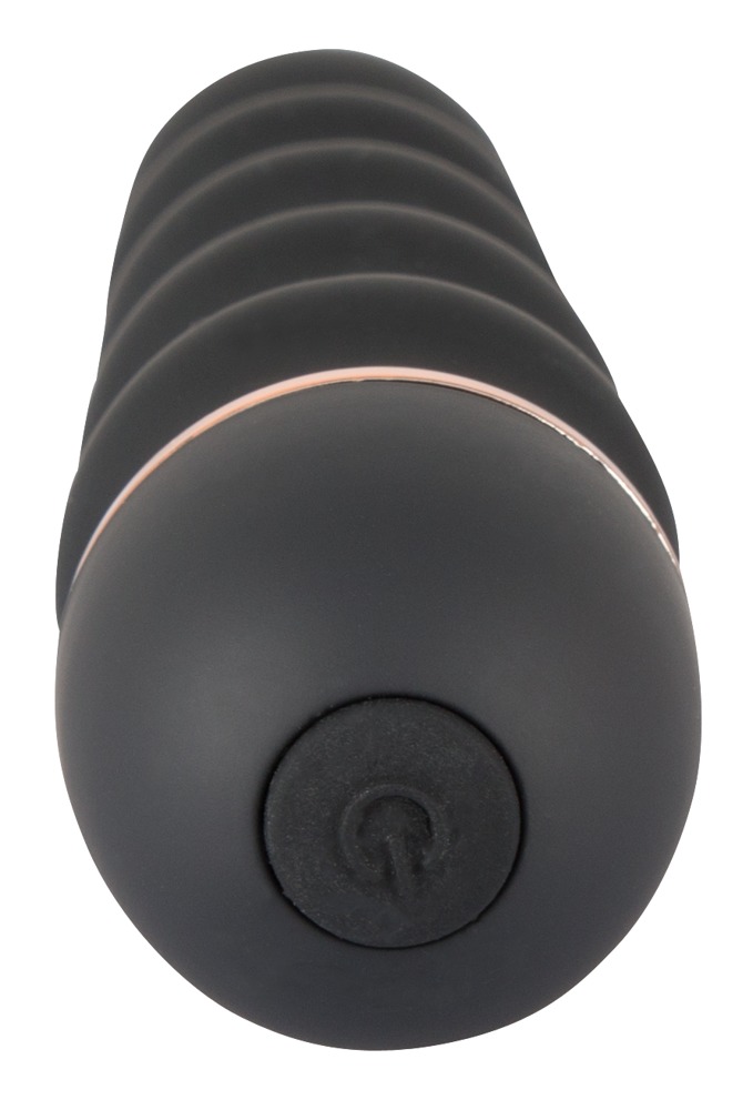 Batteriebetriebener Rillenvibrator mit Soft Touch Textur und kupferfarbenem Zierring. Mit sinnlich gewelltem Schaft für eine stimulationsintensive Oberfläche.
