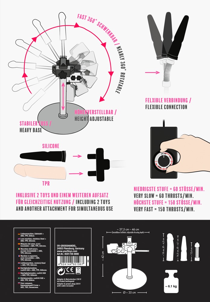 Gesamtlänge Ständer 42 cm, Naturdildo 18 cm, Analdildo 16,5 cm. Edelstahl, ABS, Silikon, TPR.
