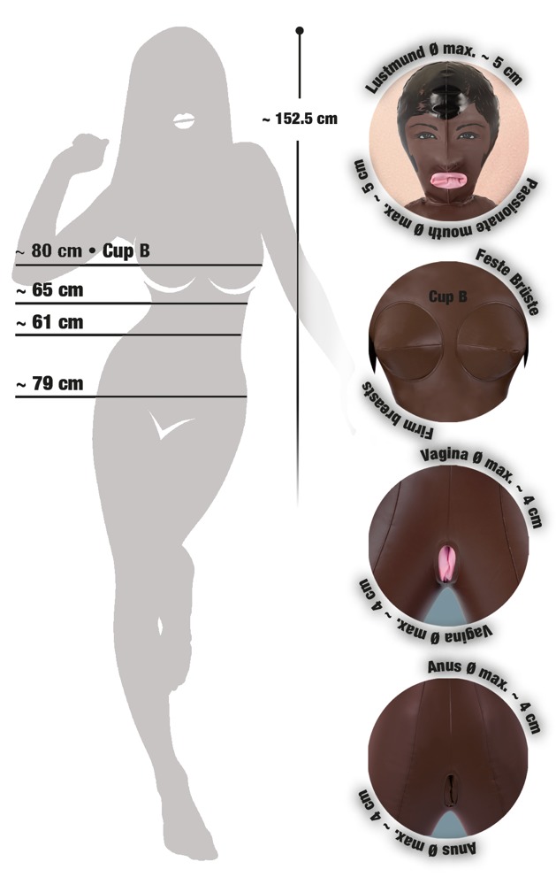 Mit 3 einladenden, engen Liebesöffnungen - Vagina, Anus und Mund - bietet diese aufblasbare Schönheit ein realistisches und leidenschaftliches Erlebnis. Die Gesamtlänge von 152,5 cm ermöglicht intensive und lustvolle Erfahrungen.