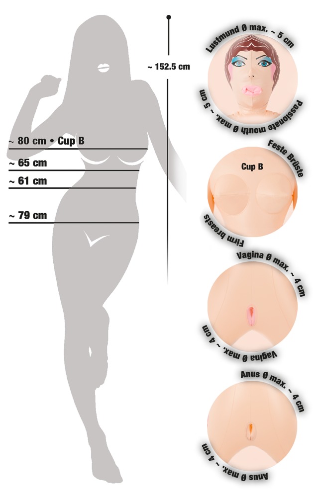 Joann verführt mit insgesamt 3 einladenden, engen Liebesöffnungen, darunter Vagina, Anus und Mund. Die Gesamtlänge von 152 cm und die sorgfältig gestalteten Einführtiefen sorgen für ein realistisches und erregendes Erlebnis.