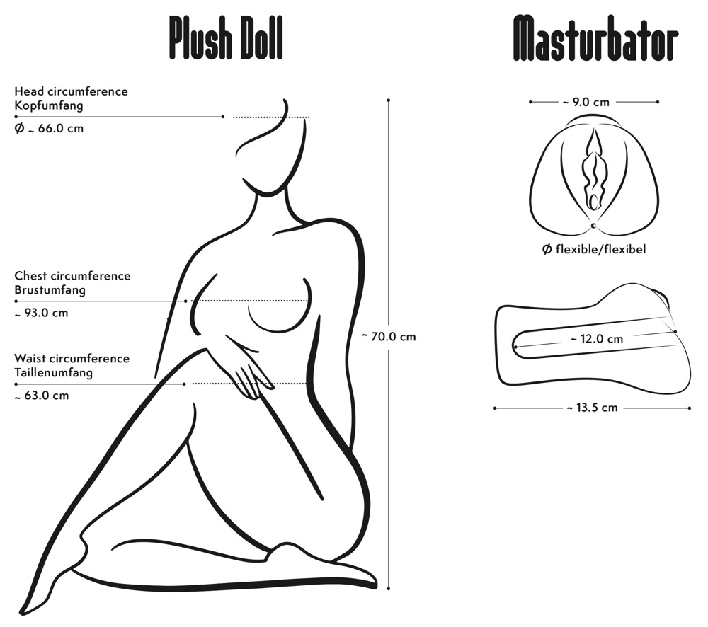 Im Schritt wartet eine Öffnung für den inklusive Masturbator in realistisch modellierter Vagina-Optik. Nach Öffnen des Reißverschlusses am Rücken wird der Masturbator einfach eingesetzt und mit dem variablen Kordelzug sicher fixiert. Das hautähnliche Softmaterial sorgt für ein intensiv gefühlsechtes Erlebnis – auch separat beim Handjob. Alternativ können andere Masturbatoren verwendet werden, sofern sie hinten geschlossen sind, damit keine Flüssigkeit ins Innere der Puppe gelangt.