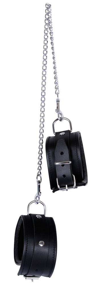 6 cm breite, verstellbare Fußgelenk-Manschetten aus schwarzem Leder, innen weich gepolstert.