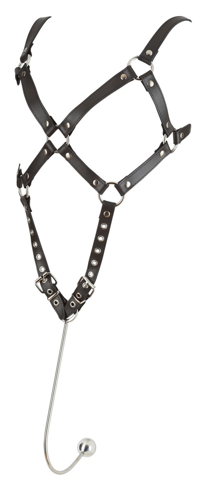 Harness mit verstellbaren Lederriemen und Edelstahl-Haken mit Kugel für die Vagina.