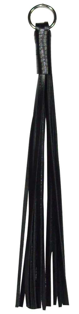 Spüre auf Deinem Körper erregende Streicheleinheiten der schmalen, schwarzen Lederstreifen an einem Finger-Metallring.
