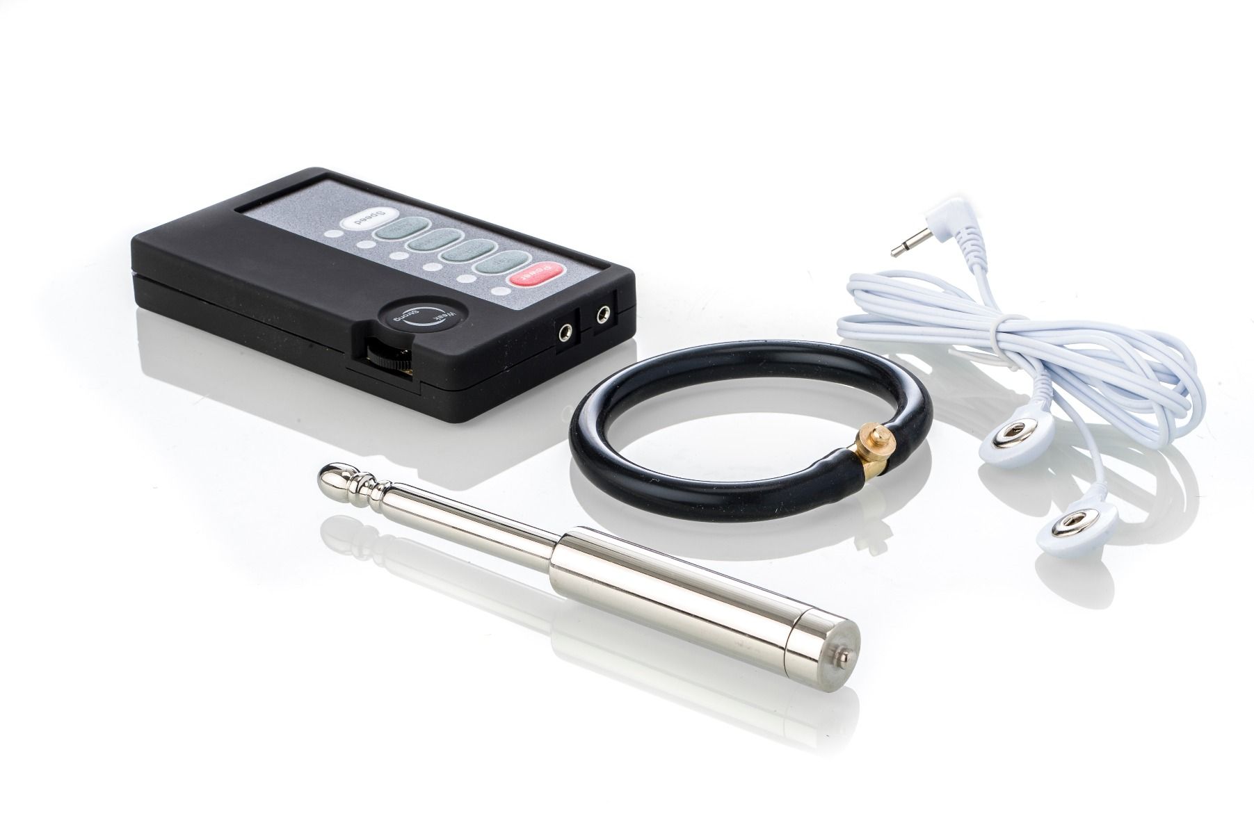 Dieses Toy-Set für Elektroschocks am Penis enthält eine Multifunktions-Fernbedienung, ein Kabel mit zwei Steckern, einen größenveränderbaren Penisring und eine Harnröhrensonde, Größe S (kurz).