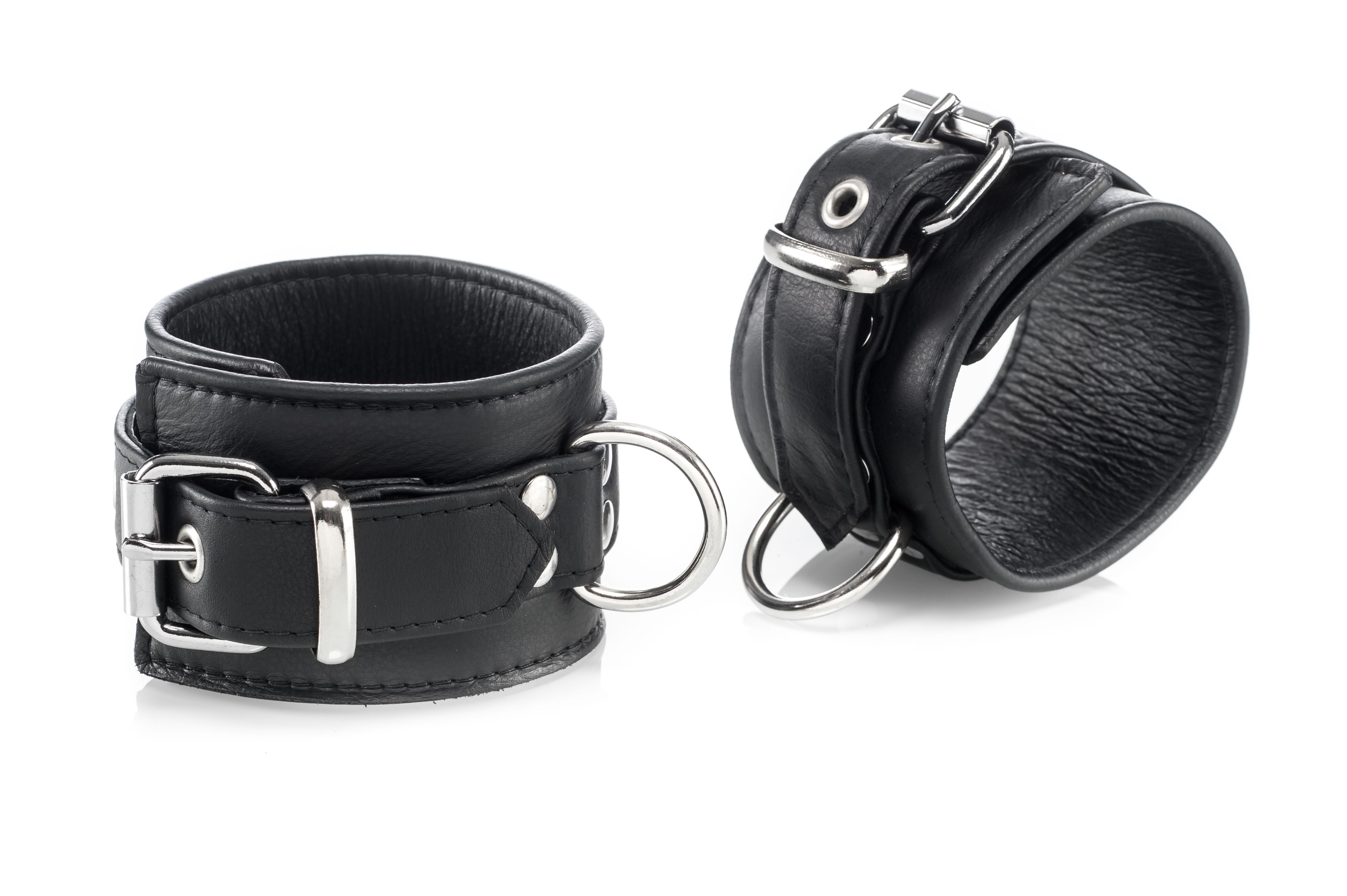 Aufwändig verarbeitetes Paar Lederfußfesseln, dreilagig genäht mit Schnallenverschluss und Karabinerverbindung.
