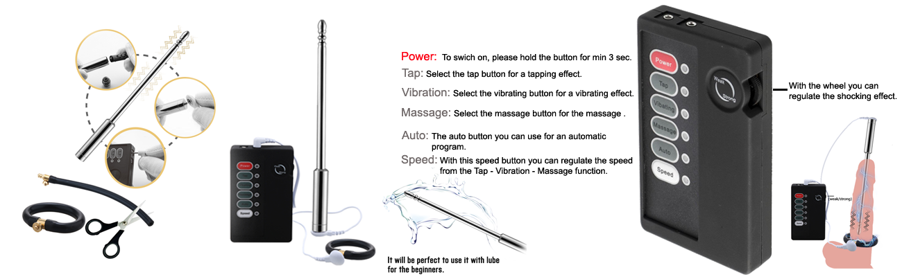 Dieses Toy-Set für Elektroschocks am Penis enthält eine Multifunktions-Fernbedienung, ein Kabel mit zwei Steckern, einen größenveränderbaren Penisring und eine Harnröhrensonde, Größe L.
